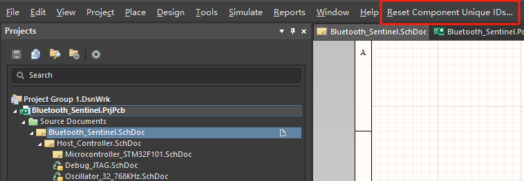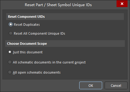 7. 點擊新的菜單Reset Component Unique IDs 選擇復(fù)位的器件和文檔范圍,進(jìn)行Unique ID 的復(fù)位。