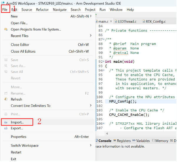 1)、打開ArmDS軟件,選擇“File-->Import...”,如圖4-1所示: