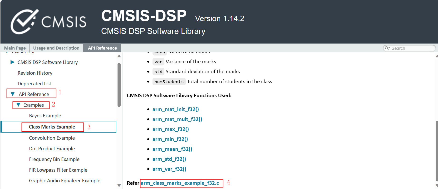 2)、在上圖中,點擊“CMSIS-DSP Library for Cortex-M and Comtex-A”,打開幫助文檔,找到“arm_class_marks_example_f32.c”文件,如圖4-2所示: