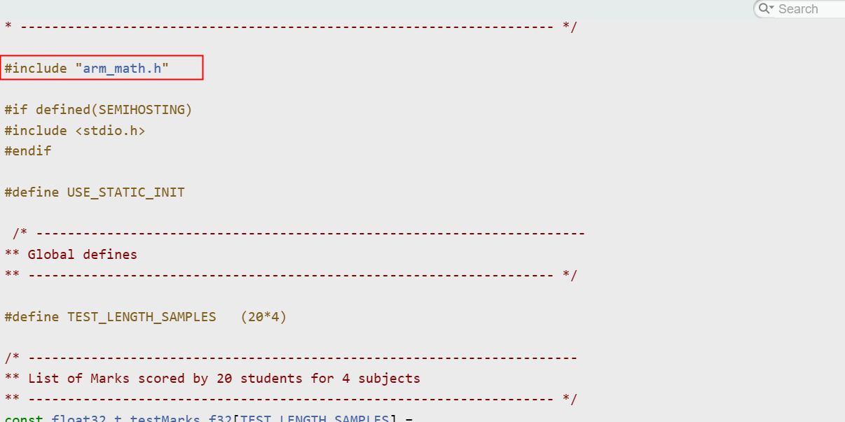 3)、打開“arm_class_marks_example_f32.c”文件,把CMSIS-DSP庫的相關的API添加到工程的main.c中,然后編譯工程,如圖4-3所示:(注:arm_math.h是CMSIS-DSP庫的頭文件)
