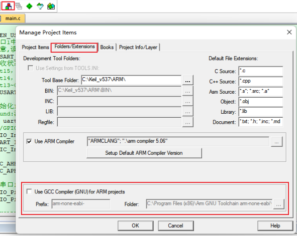 2、在KEIL中打開Manage Project Items。切換到Folders/Extensions欄,選擇勾選”Use GCC Compiler(GUN)for ARM project”,切換到使用GCC工具鏈。(如圖1)