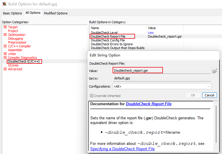 1)、DoubleCheck報告輸出需要通過Build Options中的DoubleCheck(CC++)->DoubleCheck Report File進行設置,在value窗口中去指定報告的文件名,例如:DoubleCheck_report.gsr。 (如圖4-1)