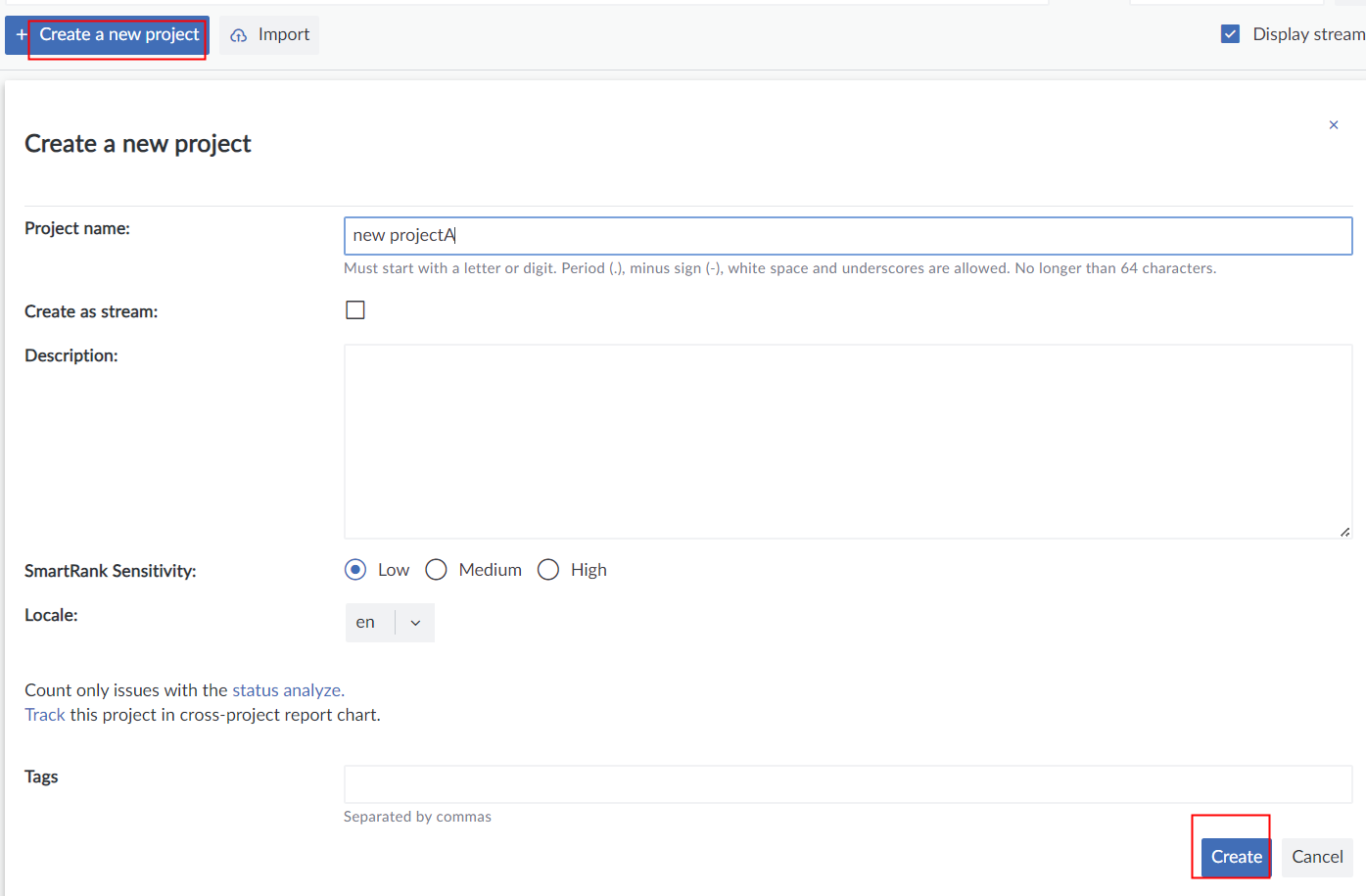 2、彈出窗口中輸入項目名稱,可以和QAC項目名稱不一致,點擊“Create”;