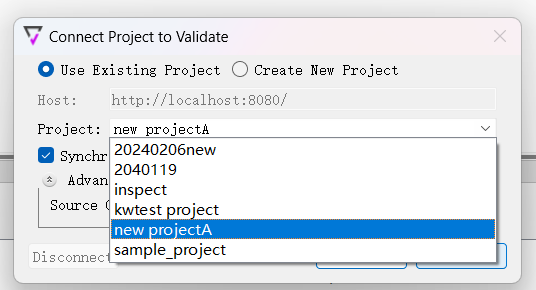 5、在彈出的Connect Project to Validate窗口選擇Use Existing Project,Project輸入項目名,勾選同步,點擊“Connect”;
