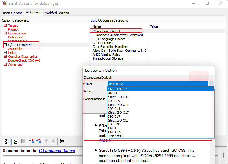 2、切換到All Options欄,找到C/C++ Compiler選項,然后找到C Language Dialect配置項,點開后,根據需要選擇對應的C語言標準(如圖4-2)。
