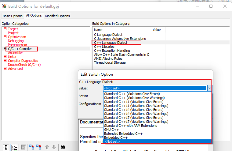 3、切換到All Options欄,找到C/C++ Compiler選項,然后找到C++ Language Dialect配置項,點開后,根據需要選擇對應的C++語言標準(如圖4-3)。