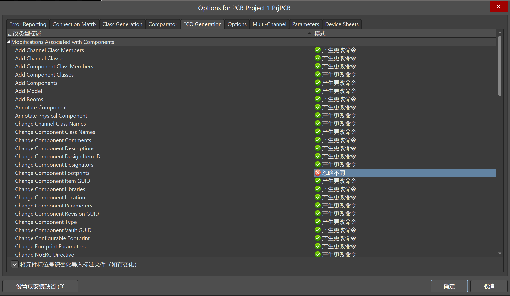 1)打開Project Options,進入ECO Generation,找到Change Component Footprint,看一下模式一欄是否設置為“忽略不同”,此模式下,封裝的變更會被忽略。將模式設置為“產生更改命令”。