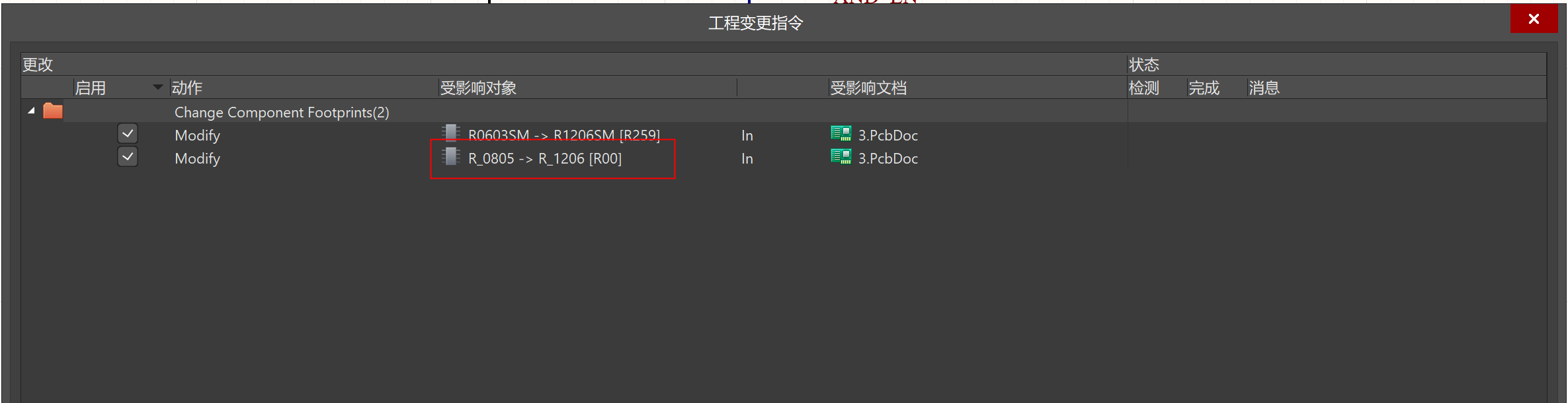 2)執行update PCB,就會出現封裝變更的信息