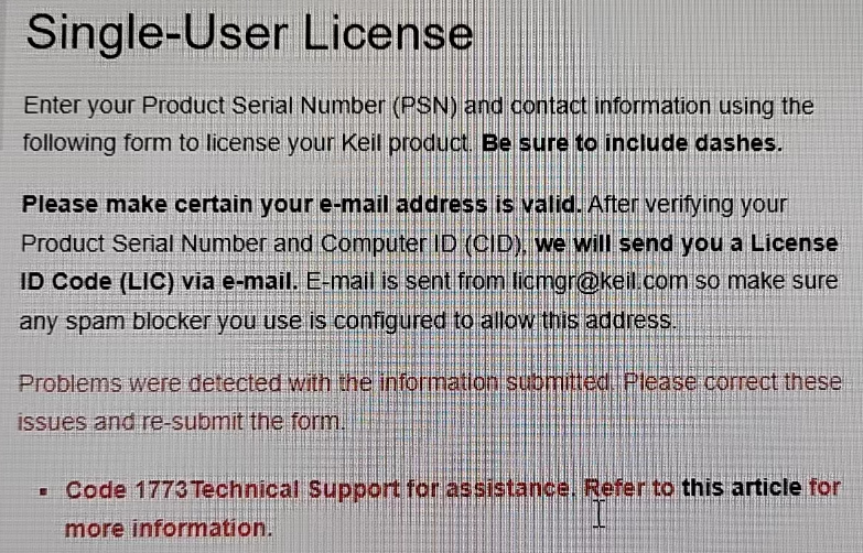 僅支持使用兩個郵箱進(jìn)行提交獲取 LIC 碼,第三個郵箱進(jìn)行提交后會出現(xiàn)以下報錯,需向 ARM 原廠提交 CASE 進(jìn)行解決。