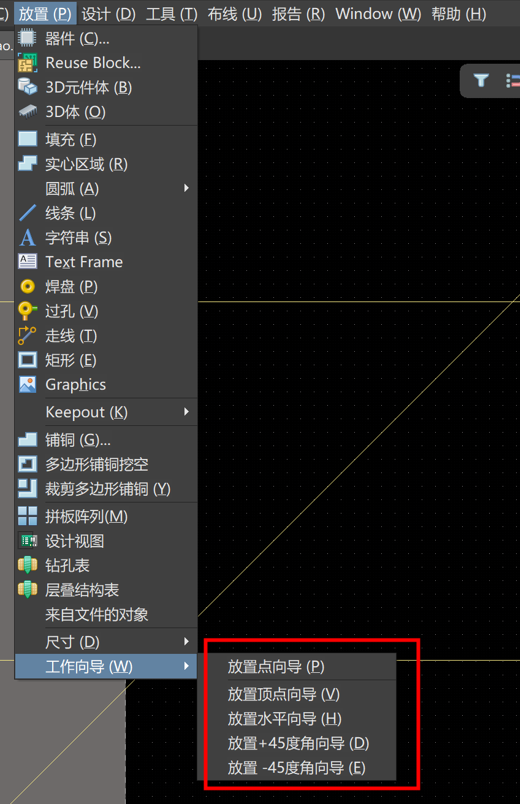 在PCB編輯界面中,通過命令“放置”-->“工作向導”可以放置參考點和參考線。