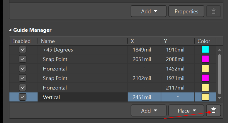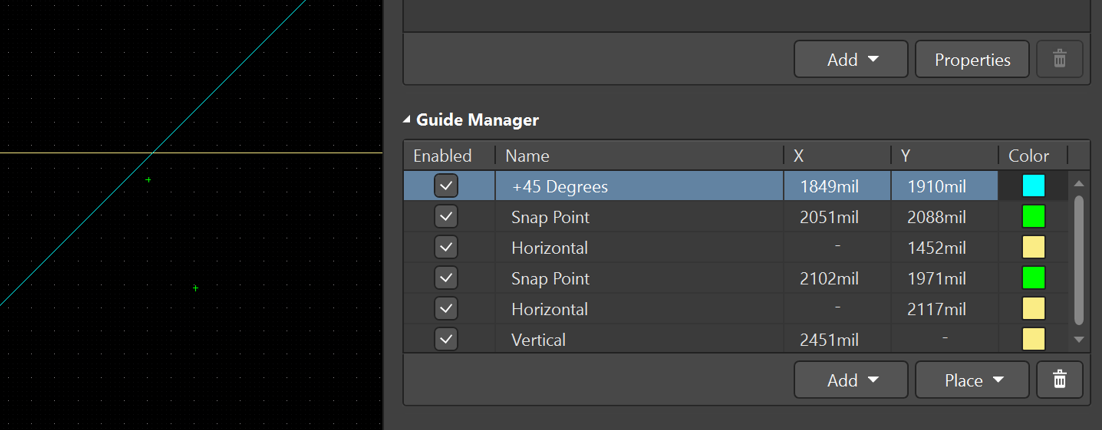 放置完需要的參考點和參考線之后,在PCB屬性面板的Guide Manager中可以看到參考點和參考線的坐標和顏色,在這里可以對它們進行修改。也可以通過Guide Manager的“Add”和“Place”來進行添加和放置。
