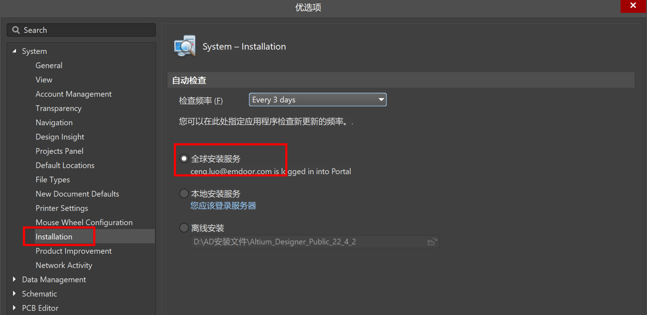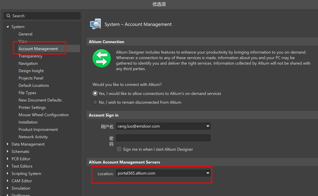 Altium Account Management Severs處選擇"portal365.altium.com"