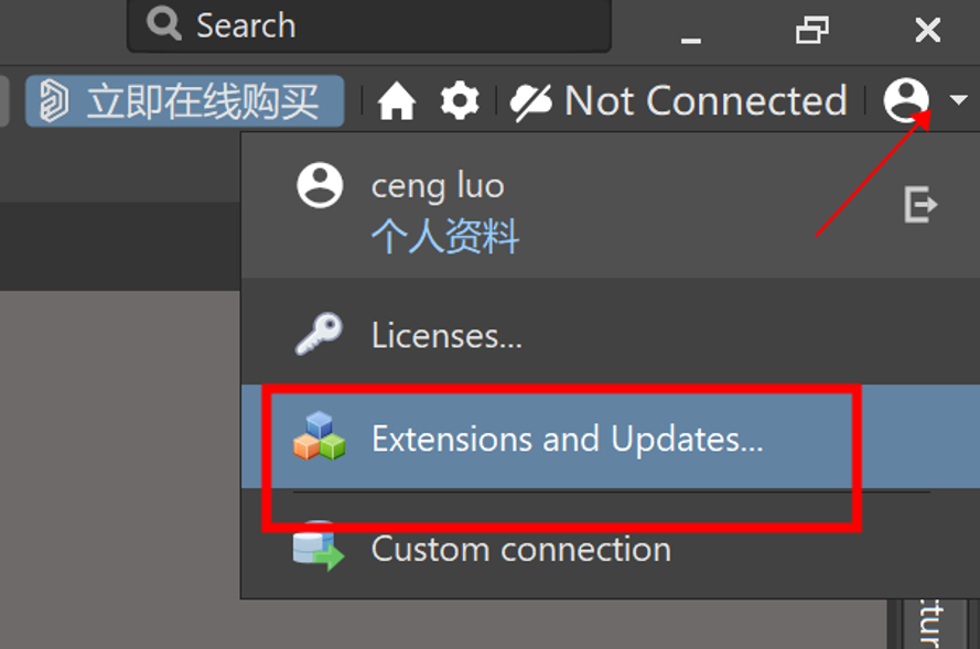 點擊右上角用戶信息的頭像,選擇“Extensions and Updates”