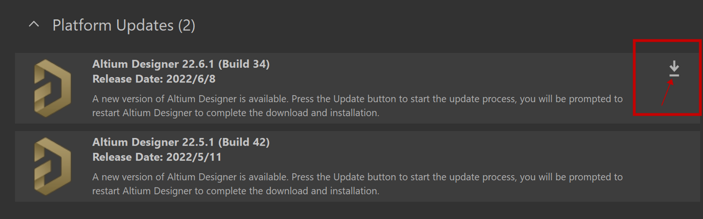 鼠標移動到對應版本上會出現下載箭頭,點擊進行下載更新。更新完只有根據提示重啟軟件。