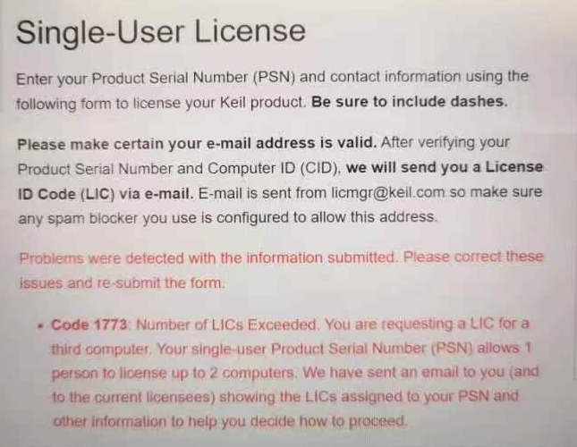 在安裝LIC時,在Keil單用戶許可證頁面上單擊Submit后出現錯誤:Code 1773 Number of LICs for this PSN Exceeded.