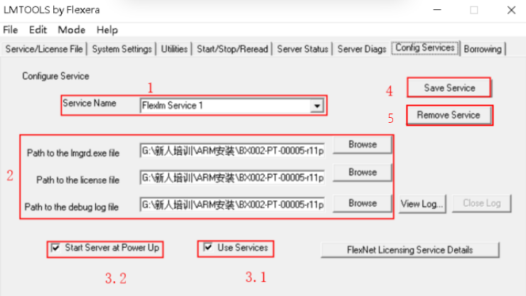 如圖4-4所示,標記1:處列出許可證服務器計算機上的所有?FlexNet 許可證服務。
