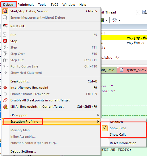 2)、進入到Debug模式下后。找到Debug->Execution Profiling。根據(jù)需求選擇Show Time(顯示執(zhí)行指令的累積時間)還是Show Calls(顯示一條指令執(zhí)行的頻率)。(如圖4-2)