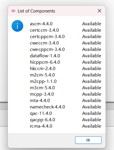 4.點擊“OK”,保存后關閉窗口彈出List of Components窗口,各組件狀態為Available,即連上license管理器成功。