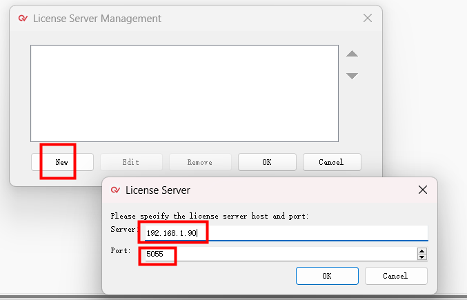 3、在License Server Management窗口中點擊“New”,彈出Licesne Server窗口,server中輸入rlm所在機器的ip,端口默認5055;