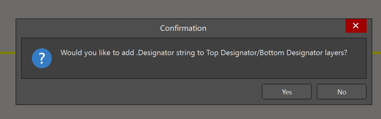 4)、確認(rèn)后點(diǎn)擊“OK”會(huì)彈出圖3對(duì)話框,詢問(wèn)是否要在指定的機(jī)械層添加特殊字符“.Designator”。由于要顯示位號(hào),所以此處選yes。