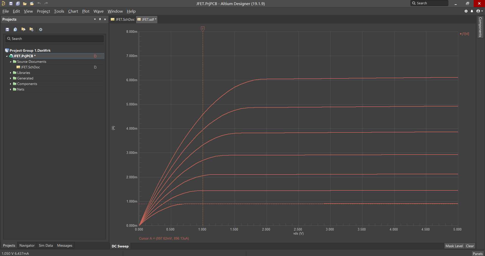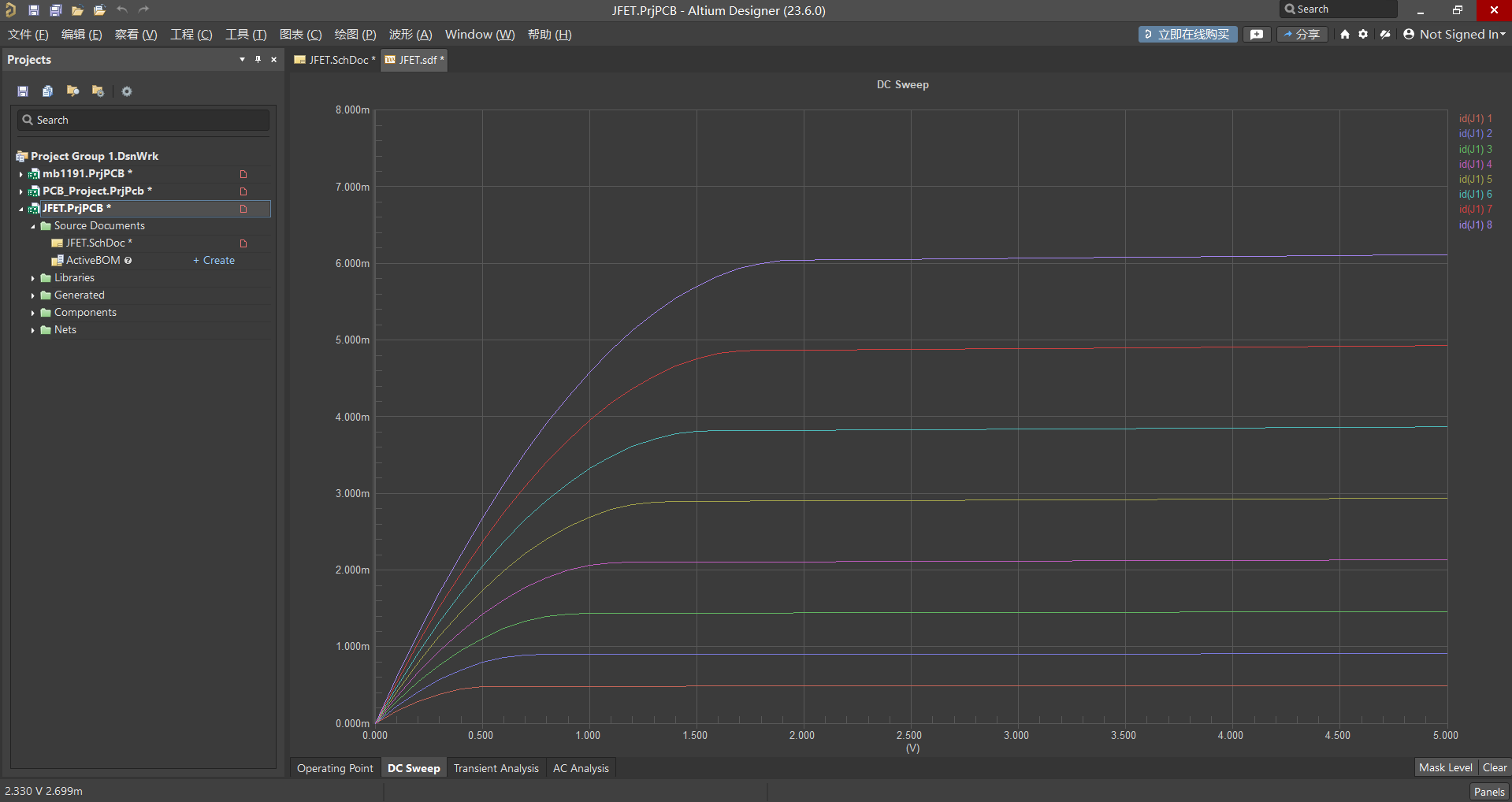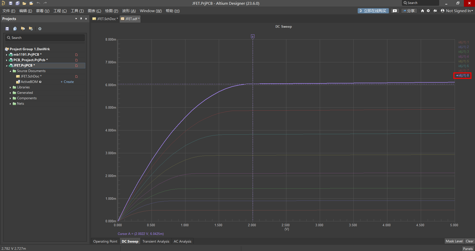 2、舊版仿真出的曲線,針對 VGS 不同的條件,每條曲線顏色顯示相同,使用探測時,顯示的數(shù)值為最底下的曲線數(shù)據(jù)。