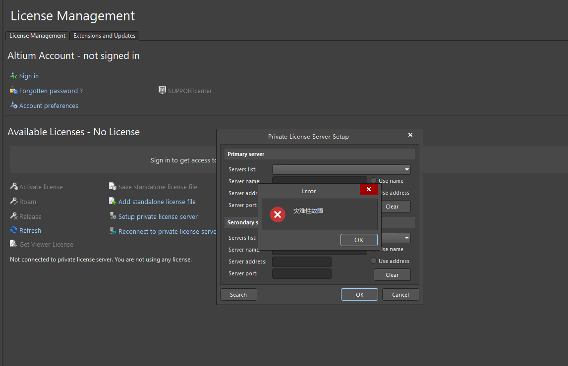 客戶AD軟件連接服務器獲取授權,出現“災難性故障”報錯(如圖1),重啟和重置軟件還是沒辦法解決,然后卸掉軟件刪除注冊表重裝軟件又出現以下報錯:Message from Primary Server: Cannot verify the status of the primary server.