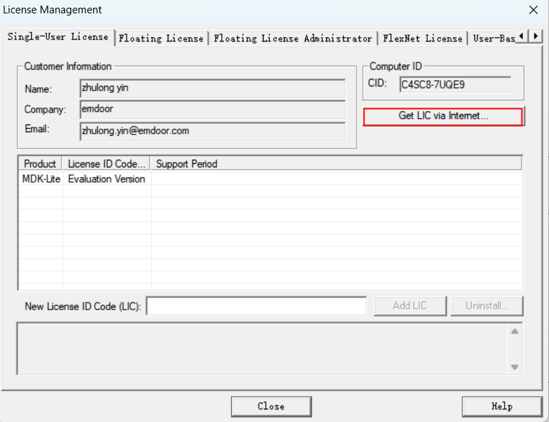 4)、點擊“ Get?LIC via Internet...“,然后單擊OK注冊產品。將打開Keil網站上的License Management頁面。
