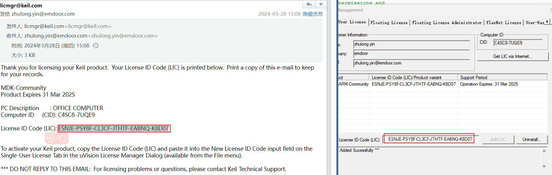 6)、在郵箱內會收到一個社區版本的LIC激活號,將其復制至軟件內的LIC填寫處,點擊<Add LIC>,即軟件激活成功。