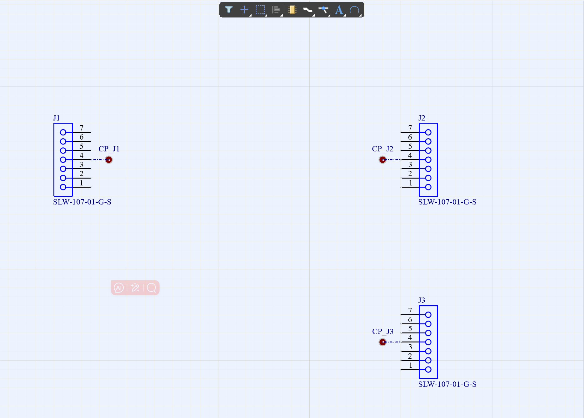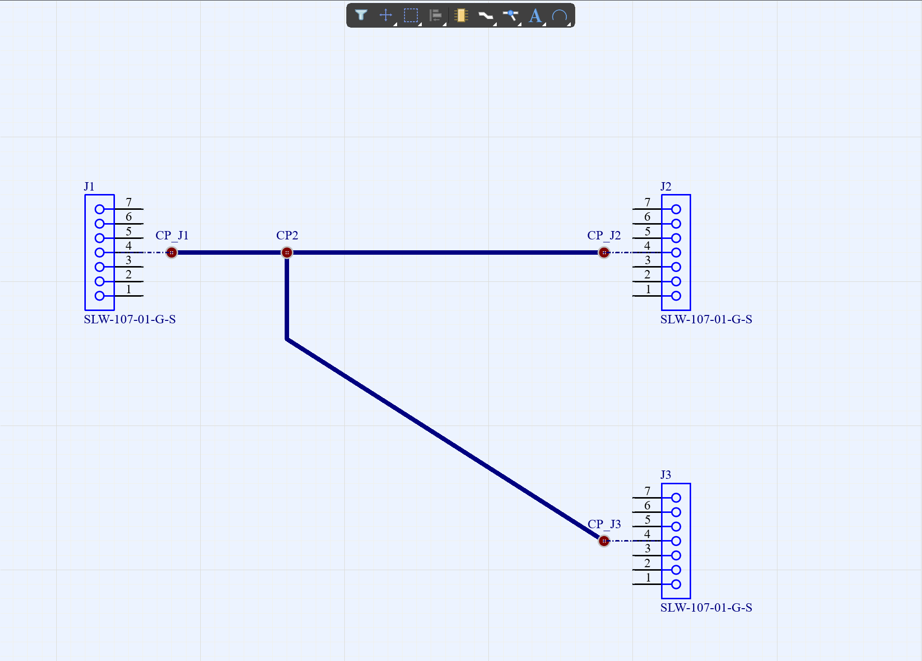 3、將這些管腳連接起來,分別對每個線重新定義他的Designator屬性(這樣可以在后面的Harness Layout中比較明確線束包含哪些段),然后給線上添加連接點,每個連接點也把命名定義清楚,最后在J3中還有未連接的管腳,在上面放置No Connect,如圖4-3。