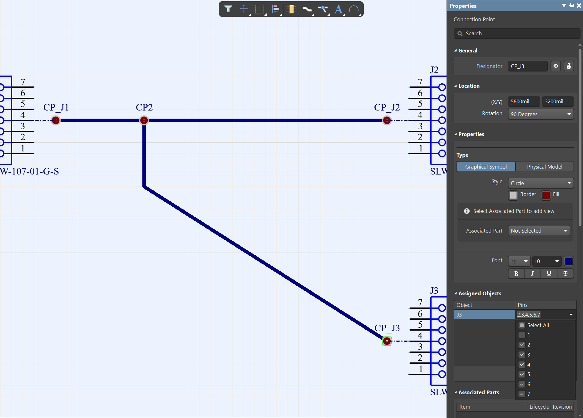 4、雙擊查看線束,連接點的一些屬性,雙擊J3(如圖4-6)設置包含的Pin,由于圖4-3中,該接插件的Pin1沒有連接,我們可以在Pins里面把1的勾選去掉,該點則標識管腳2-7,其他的點也是一樣,如果只勾選單個Pin,則表示單線連接(這會影響到線束標識的信號線),雙擊線束(如圖4-8、圖4-9),可以看到除了J1-1兩邊都有,表示這是同一根線,中間沒有連接點,其他的都是分開成兩段的線合成的線束。其他的在屬性里面修改一些線束和連接點的style。