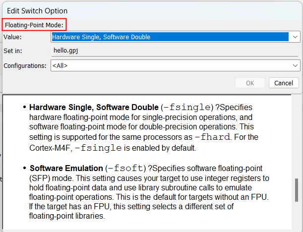 Hardware Single, Software Double (-fsingle) 用于單精度操作的硬件浮點(diǎn)模式,用于雙精度操作的軟件浮點(diǎn)模式。與-hard相同的處理器支持此設(shè)置。對于Cortex-M4F,默認(rèn)開啟-fsingle。
