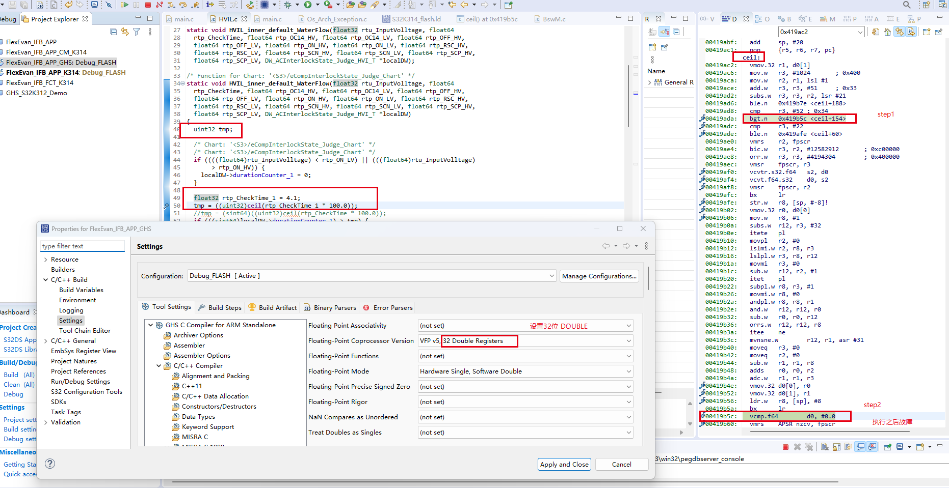 2)、查看匯編語言出現(xiàn)vcmp.64調(diào)用,并且函數(shù)執(zhí)行到該地址時(shí)出現(xiàn)故障,同步修改配置選擇。