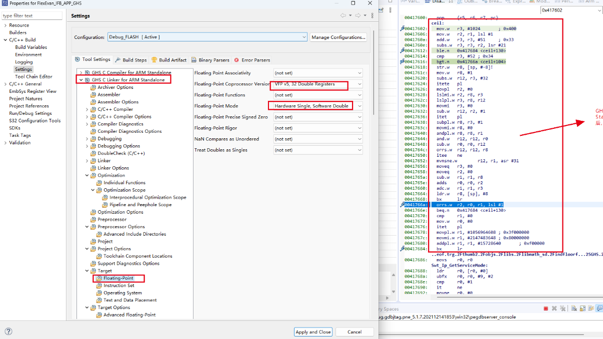 3)、將 “Floating-Point Coprocessor Version”同步設(shè)置為“VFP v5, 32 Double Registers”,設(shè)置完成后程序運(yùn)行成功。無vcmp.64調(diào)用。