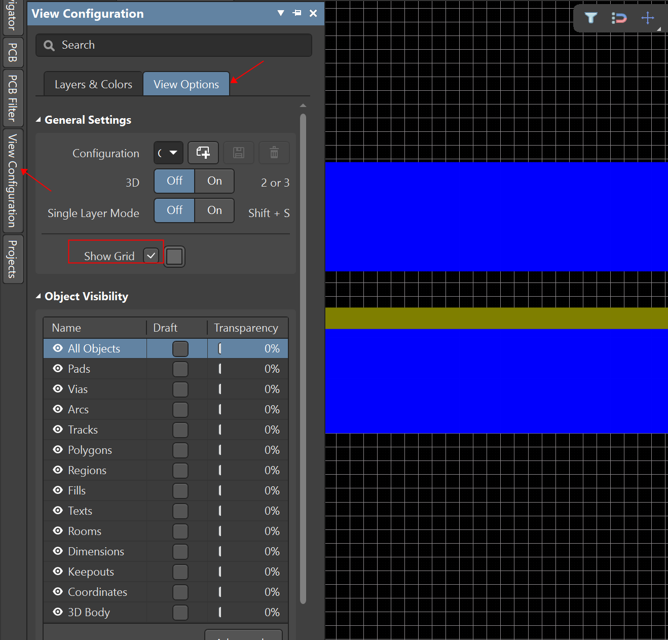 PCB設計中,可以對柵格進行設置大小,用以輔助布局布線。有時候因為誤操作會把柵格隱藏,或者拿到別人做的PCB文件進行修改,原設計人員將柵格隱藏了,又不知道怎么設置才能顯示柵格;