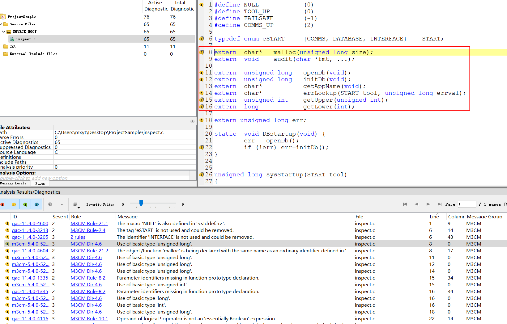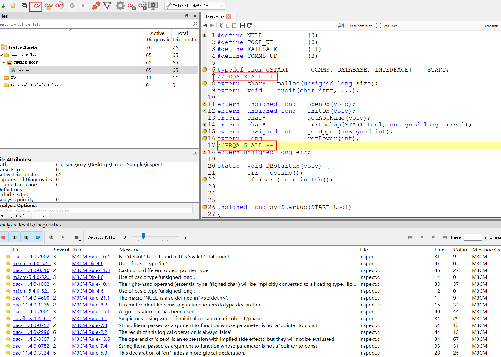 2、在不想參加掃描的源碼開始和結尾處添加注釋“ //PRQA S ALL ++”和“ //PRQA S ALL --”,保存,點擊分析按鈕重新掃描項目;