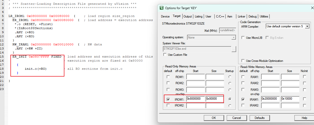 //因為芯片的其實地址是0x08000000,大小是0x00080000,所以在散步文件中在0x08080000創建一個根區域。