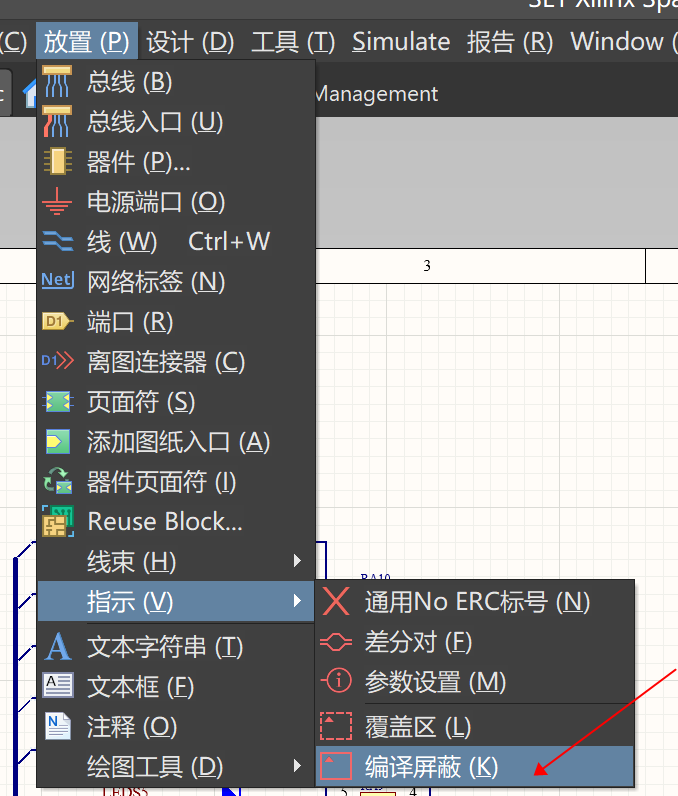 1)、執行”放置“-->“指示”-->“編譯屏蔽”,放置編譯屏蔽區域。