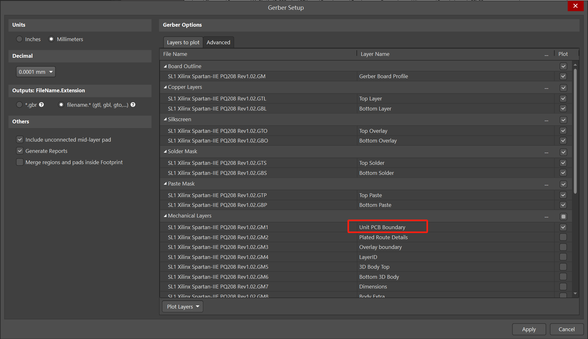 另外我們在輸出設置的時候,除了輸出基礎的一些層信息,還需要特別注意一下這里的板框層,如圖中我的板框層是叫“Unit PCB Boundary”輸出后綴是.GM1,這樣以確保在華秋DFM中可以看到板框。