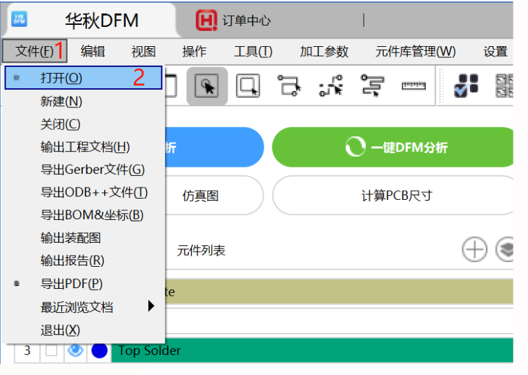 2、接下來是導入華秋DFM,打開軟件選擇文件-打開,然后選擇剛才保存Gerber的文件夾,將里面全部的文件導入進去。