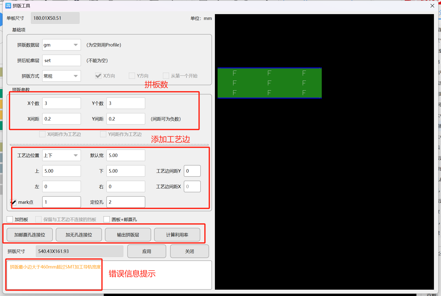 3、根據自己要拼板的數量和對板廠工藝邊、Mark點、定位孔的要求進行填寫。這里舉例V割拼板,大概會切除0.2mm的板,間距可以稍微多留一點,還需要注意的是,對話框最下面有錯誤信息的提示,否則拼板在制作工藝上會出現問題。