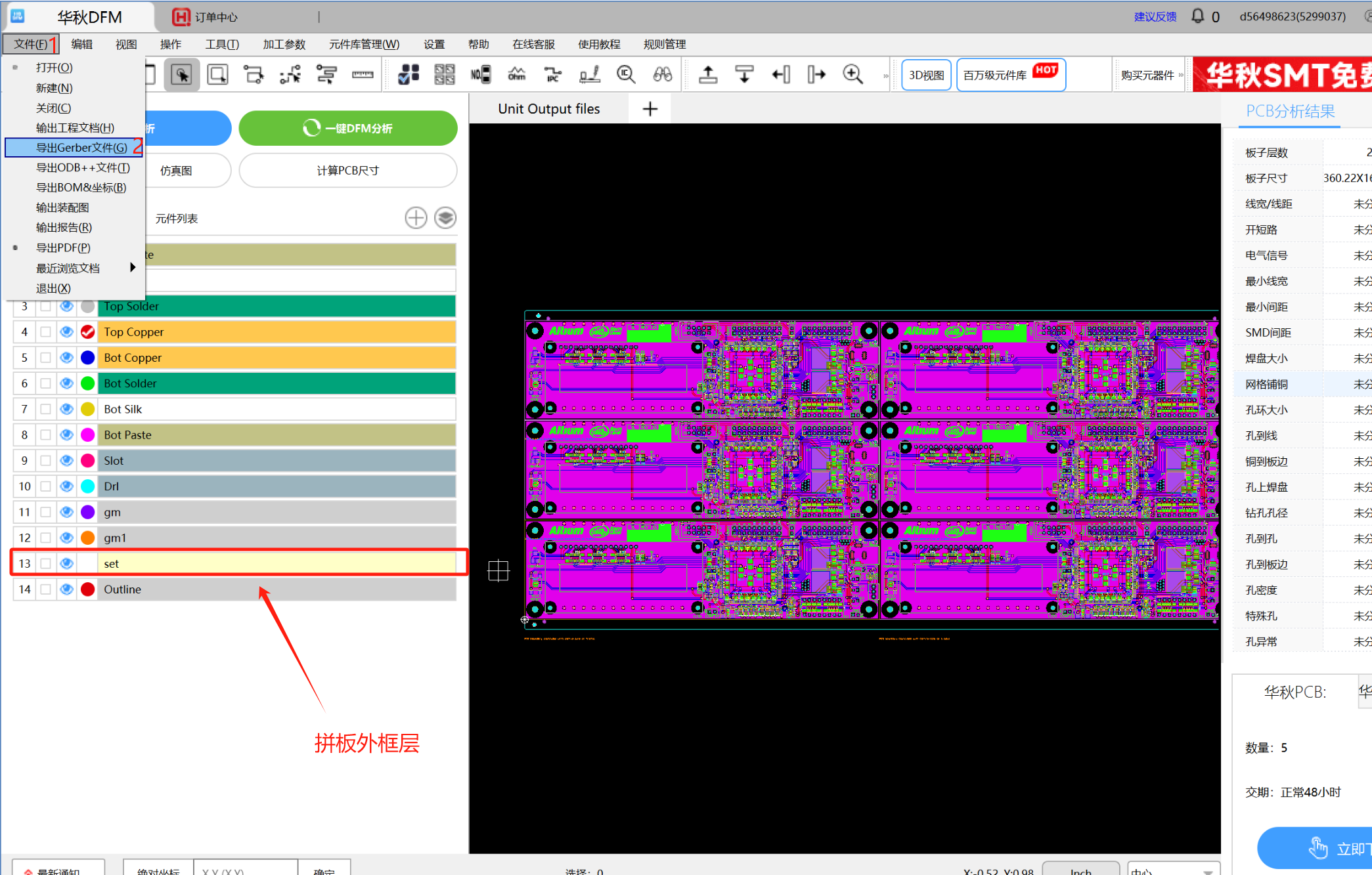 4、拼板完成后在華秋DFM中會多出來一個set層,這里是拼板后的外框層。在文件-導出Gerber文件然后保存至新文件夾,然后也可以在AD中打開查看拼板后的Gerber。
