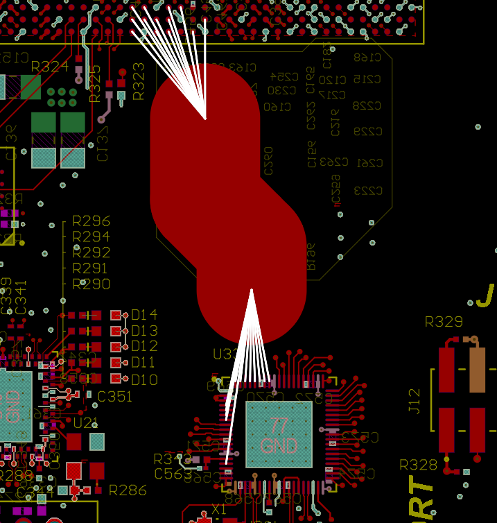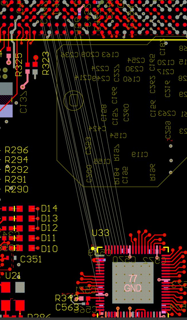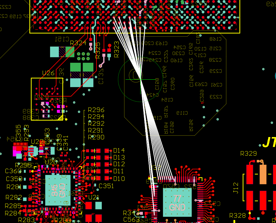 在PCB編輯器界面中,按住ALT鍵并單擊鼠標左鍵,通過框選方式從右至左選擇目標飛線(Net Lines)。系統將高亮顯示選中的飛線,如圖3所示。