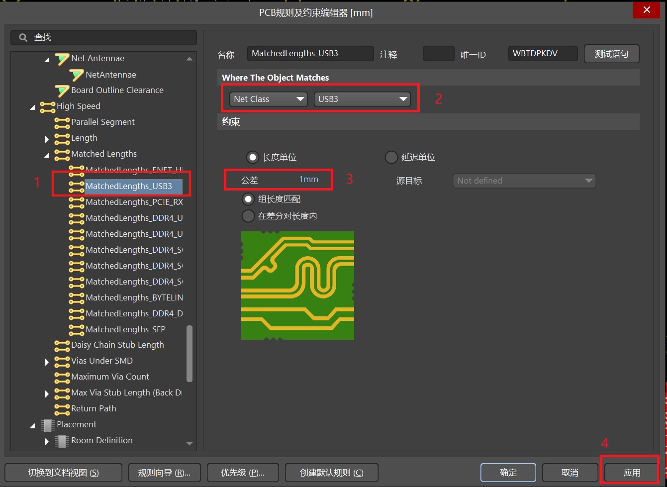 ○ 網絡選擇:在Where The Object Matches欄中指定網絡類(Net Class)為USB3,確保規則僅作用于目標信號組。