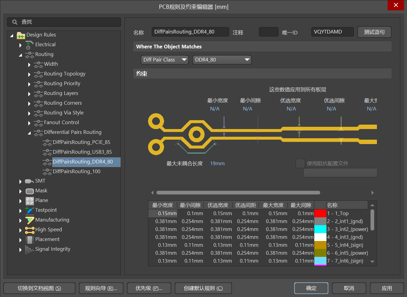 ■ 設(shè)置差分布線規(guī)則 :在 PCB 設(shè)計(jì)中,設(shè)置差分布線的布線規(guī)則,如線寬、線距、耦合長度等。可以通過在 “Rules” 面板中添加 “Differential Pair Routing” 規(guī)則來實(shí)現(xiàn)。