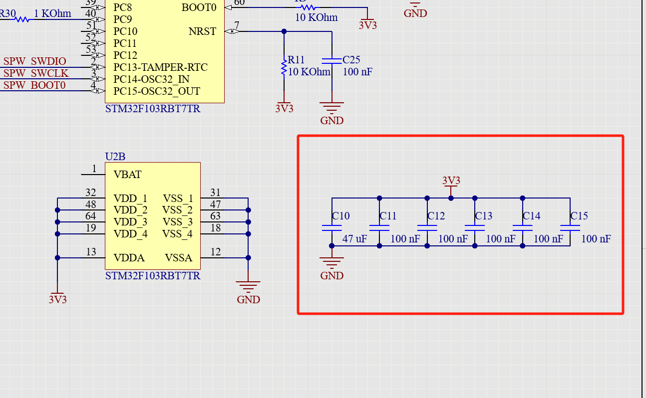 ■ 添加電源元件 :在原理圖設(shè)計(jì)中,添加電源元件,如電源芯片、電容等??梢酝ㄟ^在元件庫中選擇相應(yīng)的元件并放置在原理圖中來實(shí)現(xiàn)。(圖中添加電容濾波)
