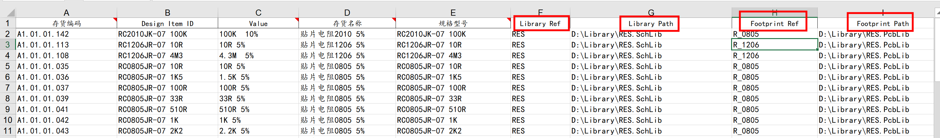 首先,需要建立一張數據表作為元器件數據庫文件,第一行如下圖添加表頭,并填入對應元器件信息,每一項參數值不能使用Excel中的公式。