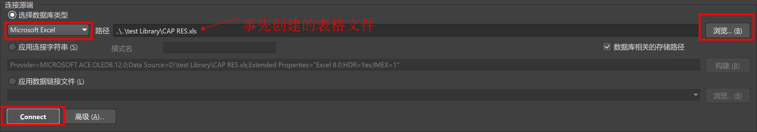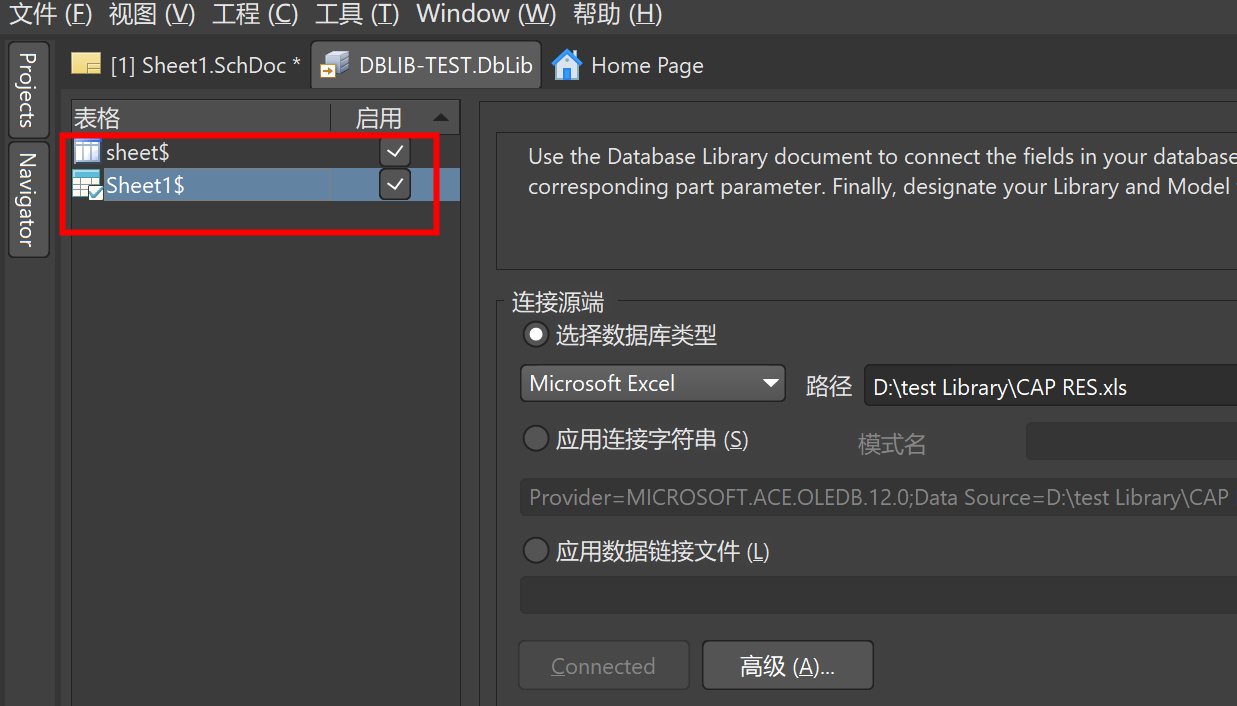 在Altium Designer中點擊File->New->Library->Database Library,打開新建Dblib窗口,選擇對應的表格文件格式,點擊右側“瀏覽”圖標選中建好的表格文件,點擊“Connect”進行連接。