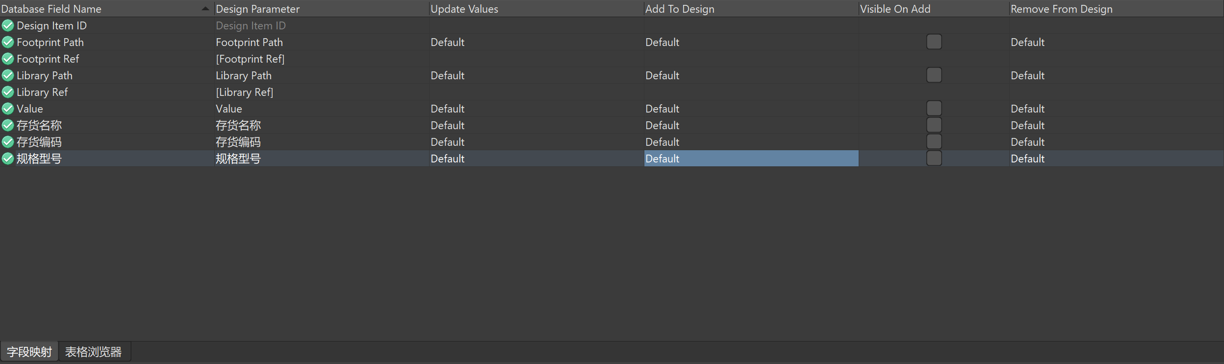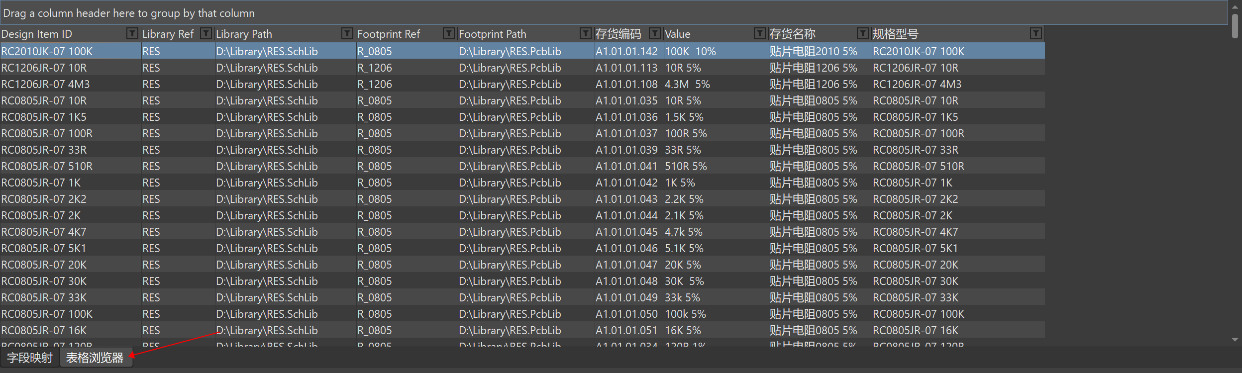 在AD中打開Dblib文件,在Dblib編輯窗口的左側,有表格列表,可以看到當前數據庫文件中包含了幾張表格,并且可以通過打勾來決定是否啟用此表格。當在Excel或Access文件中包含了多張表格時,在此處就會全都顯示出來。打勾啟用后,在調用元器件的時候就可以看到已被啟用的多張表格中所有的元器件信息,以此來作為元器件分類。