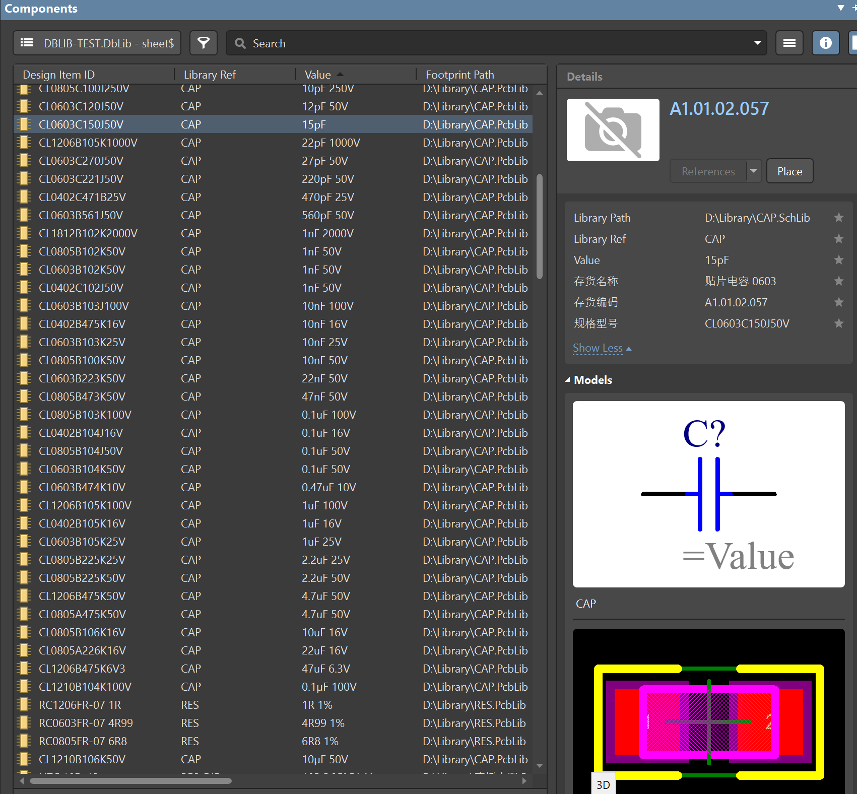 然后就是和其他元器件庫一樣進行調用,在元器件選擇窗口,可以看到元器件的所有參數,關聯的原理圖符號和PCB封裝。