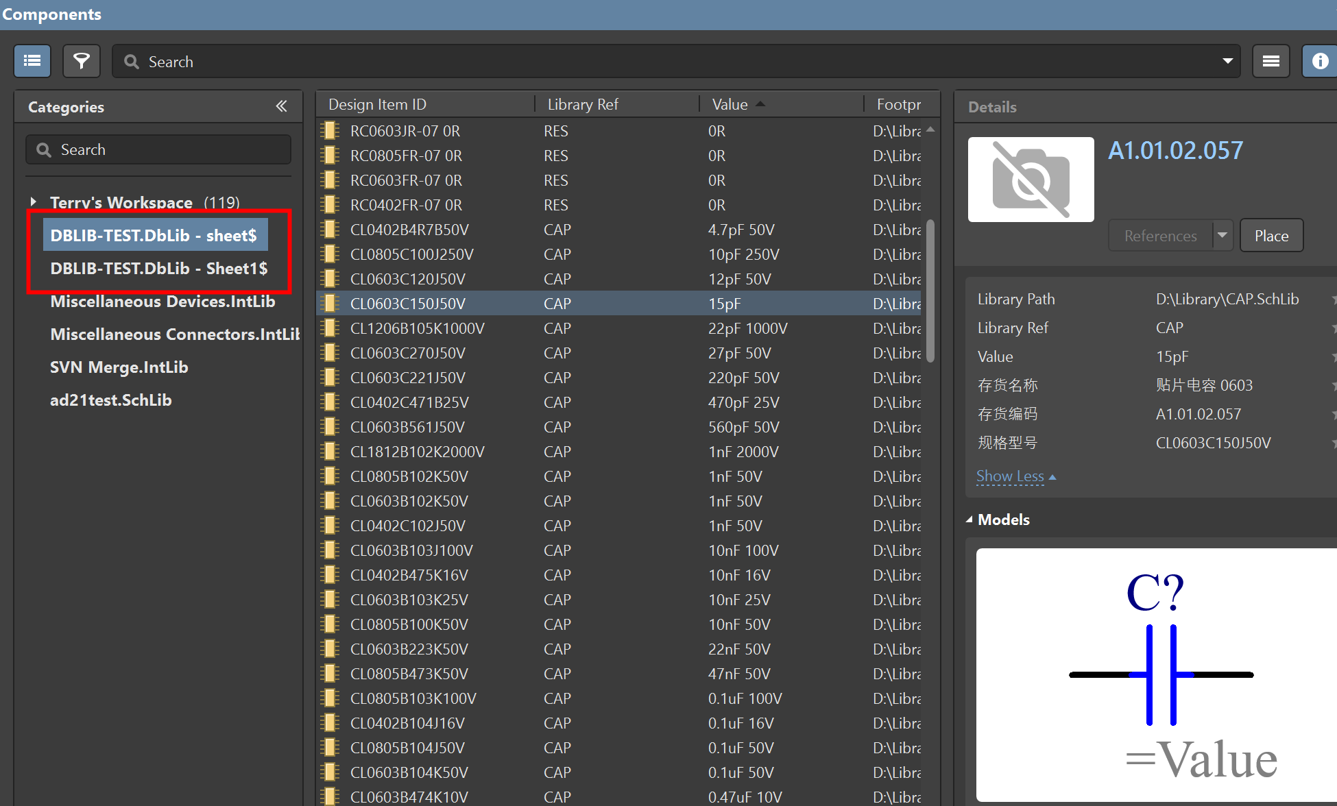 將元器件放置到原理圖上,在元器件屬性中,所有參數,關聯PCB封裝,都一一顯示。到這里,一個Dblib文件的創建過程就算結束了。那么一定有人會問,這樣把所有元器件都放在一張表格中,不利于元器件分類查找,能否將元器件進行分類?當然是可以的,接著往下看。